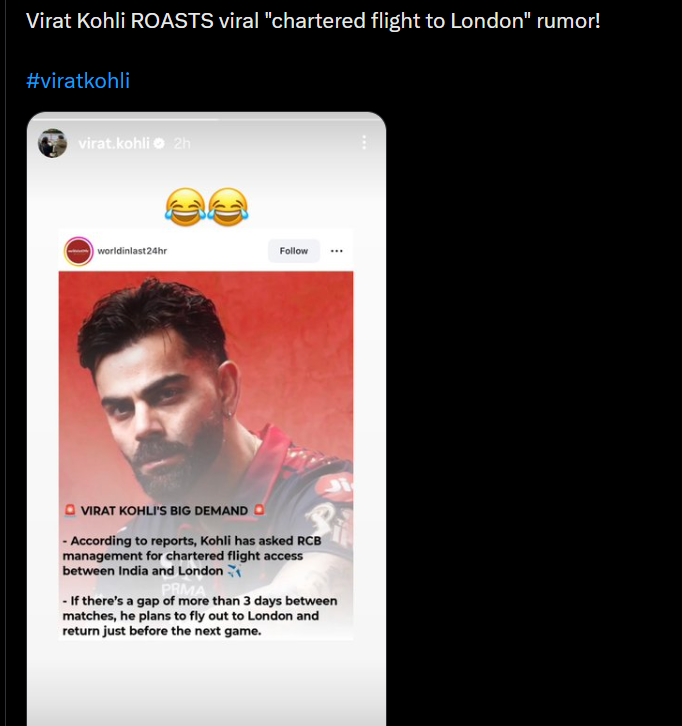 The post also mentioned that the star batter will fly to London to be with his family if there’s more than a 3-day gap between matches. However, Kohli has brushed off the rumour, sharing the post with a laughing emoji on his Instagram account.