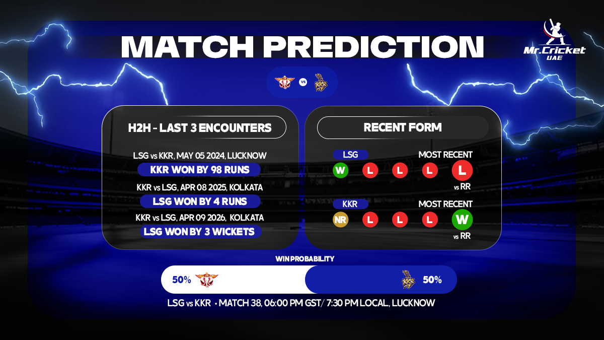 Lucknow Super Giants (LSG) will look to end their losing streak in the Indian Premier League 2026 (IPL 2026) as they take on Kolkata Knight Riders (KKR) in Match 38 on Sunday, April 26, at Bharat Ratna Shri Atal Bihari Vajpayee Ekana Cricket Stadium, Lucknow. The Rishabh Pant-led side started the tournament well, winning two out of their first three games.
