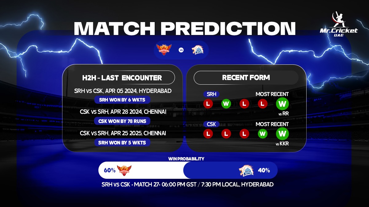 Sunrisers Hyderabad (SRH) will take on Chennai Super Kings in Match 27 of the Indian Premier League 2026 (IPL 2026) on Saturday, April 18, at Rajiv Gandhi International Stadium, Hyderabad. Both teams are coming into the fixture having won their respective previous encounters.